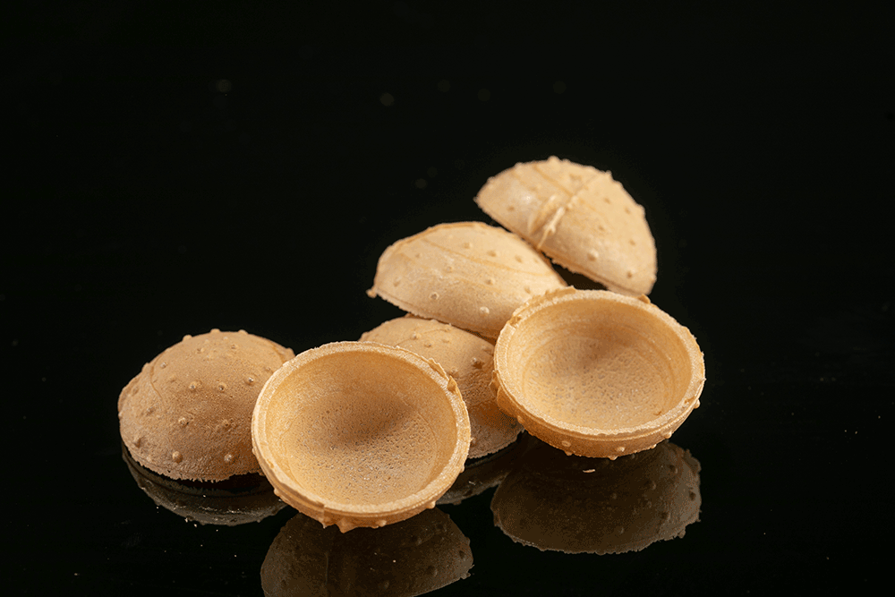 Μπαλάκια βάφλας κομμένα. Έχουν ουδέτερη γεύση γι αυτό και ταιριάζει με όλες τις πραλίνες. Αποτελούνται από συσκευασίες 1000 τεμαχίων.